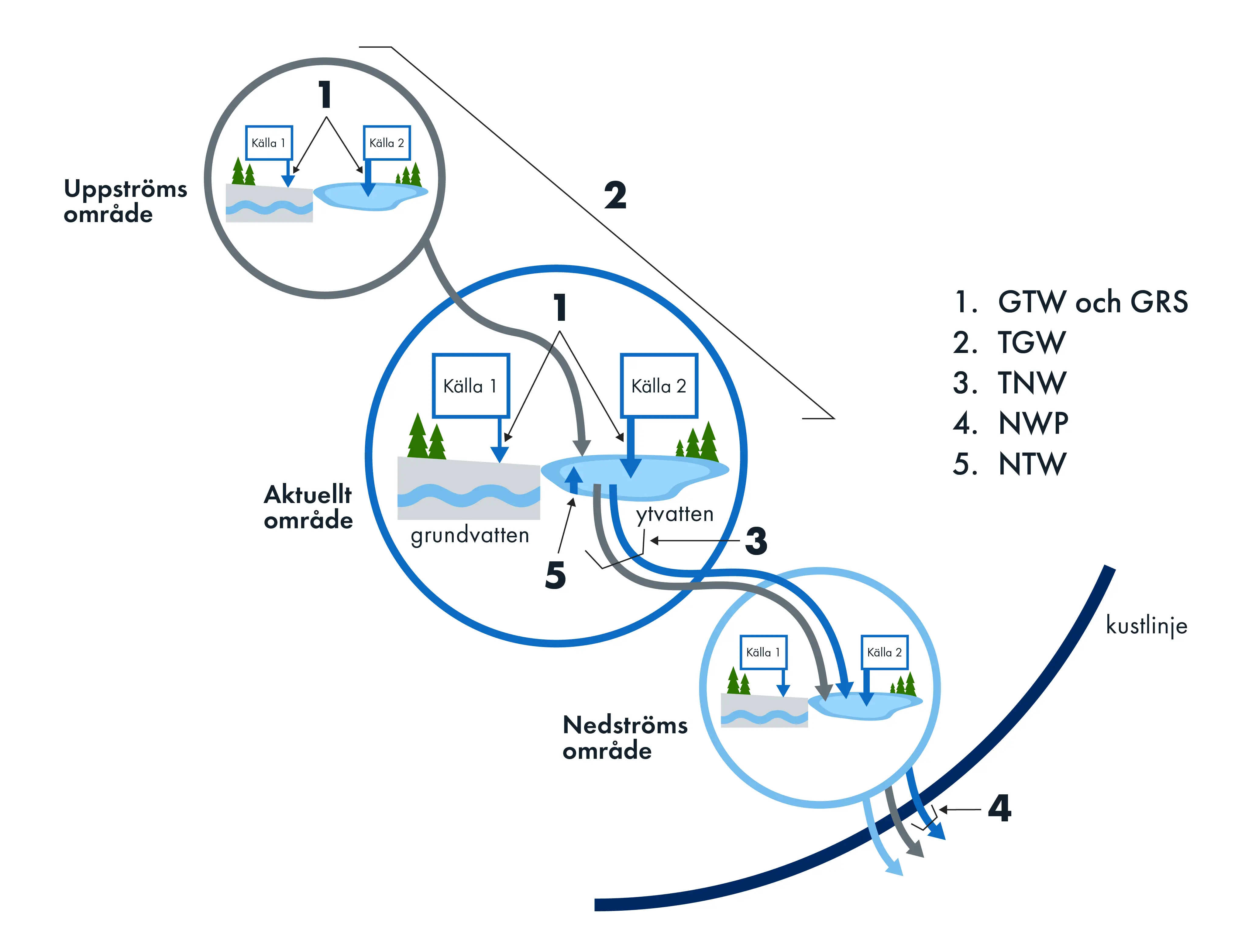 Förstora bildenFörklaringsskiss över källfördelningstyper som redovisas i VattenWebb. Typförkortningar som skrivs med svart text motsvarar de källfördelningar som redovisas för det aktuella delavrinningsområdet. De mörkblå pilarna symboliserar belastning från utsläppskällor i det aktuella delavrinningsområdet medan grå och ljusblå pilar symboliserar belastning från utsläppskällor i uppströms-/nedströmsområden.