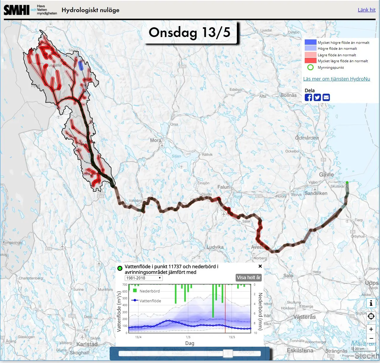Förstora bildenVisualisering av aktuella flöden i Västerdalälven vid Malung 2020-05-13. Linjernas färg i kartan anger om flödet är högt eller lågt. Blå färg betyder högre flöde än normalt, röd färg betyder lägre flöde än normalt och svart betyder att flödet är normalt. I det här exemplet har de flesta mindre vattendrag högt upp i avrinningsområdet lägre flöden än normalt, längre ned i Dalälven är flödet mer normalt. I ett litet område högt upp i avrinningsområdet är flödet högre än normalt.