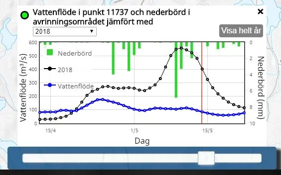 Vattenflödet för den valda punkten visas i diagrammet med en blå linje och nederbörd, observerad och prognos visas med gröna staplar. Nederbörden gäller för områden uppströms den valda punkten.