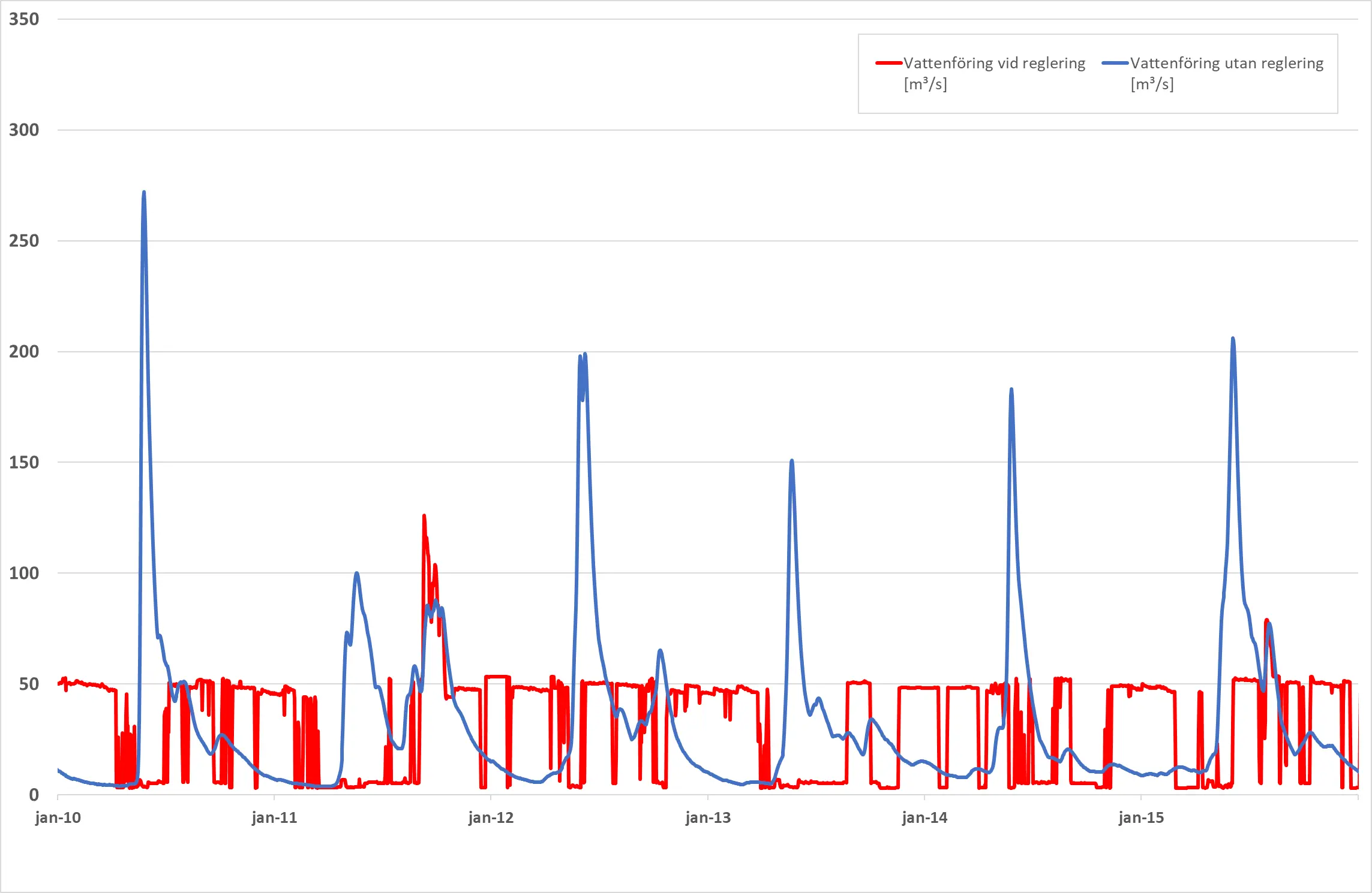 Förstora bildenExempel på skillnad mellan reglerad och oreglerad vattenföring i ett vattendrag i norra Sverige. Blå linje visar modellerat flöde för en vattendragssträcka i Umeälvens avrinningsområde. Här syns en tydlig vårflod och ett lägre vinterflöde. Röd linje visar uppmätt vattenföring vid samma plats. Här syns en tydlig påverkan av regleringarna.