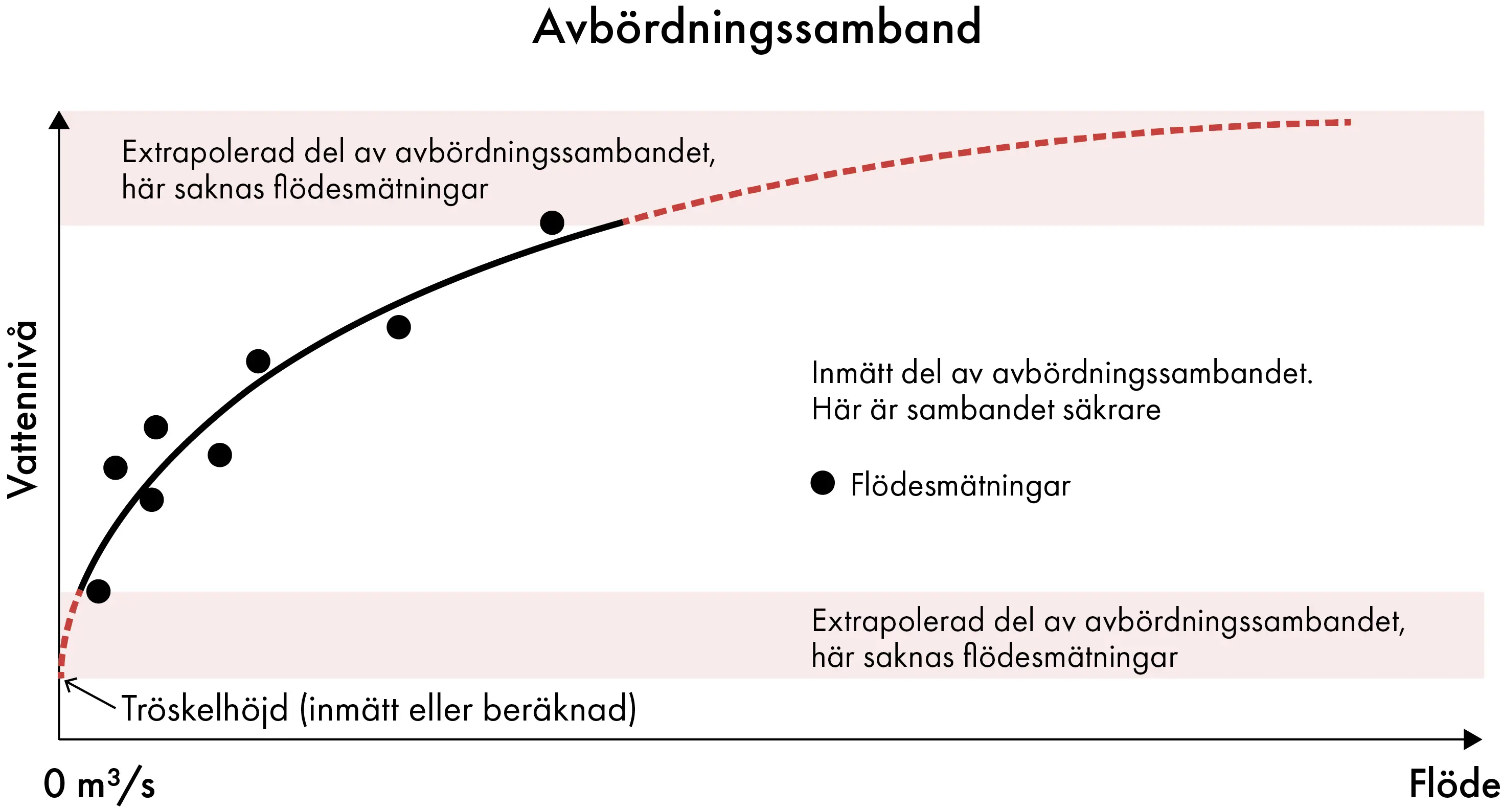 Det krävs flera mätningar vid låg, medel och högflöden för att kurvan ska bli så korrekt som möjligt. Om flödet är mycket högt eller mycket lågt, hamnar man utanför mätningarna och avbördningssambandet är då skattat (röd linje i illustrationen ovan).