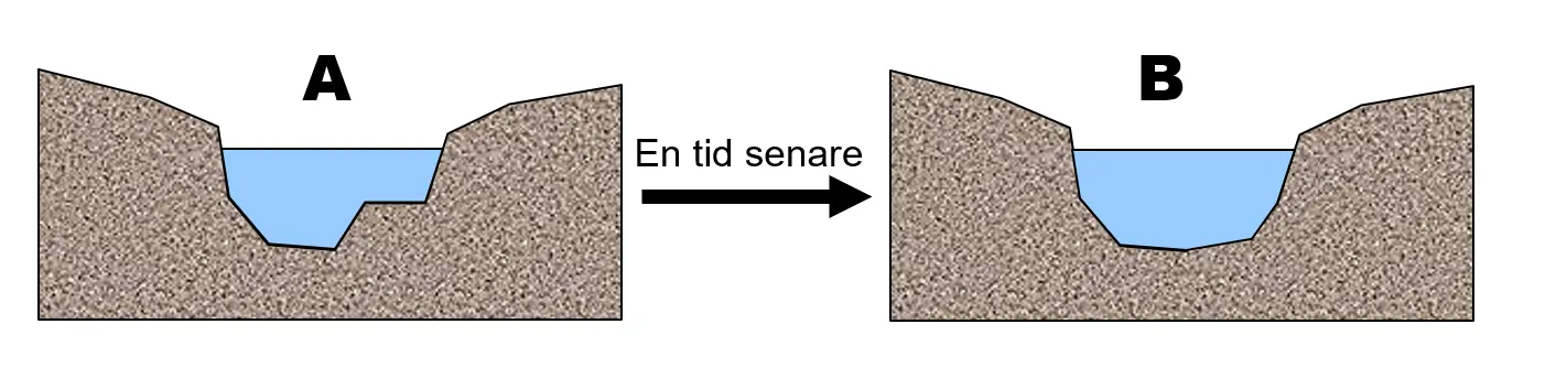 Förstora bildenVattenstånd och vattenhastighet är lika vid tidpunkt A respektive B men vattenföringen är högre vid B eftersom fåran eroderats och tvärsnittsarean är större.