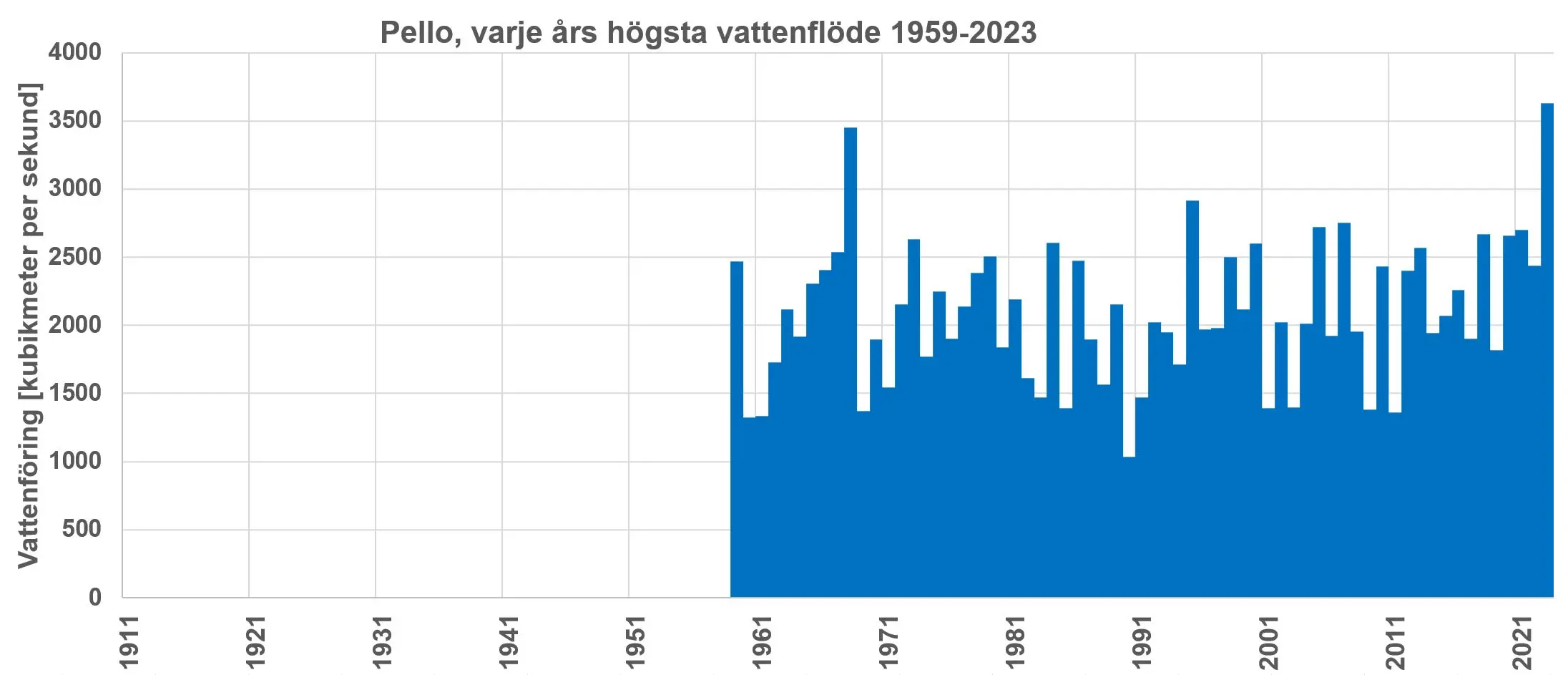 Vid de flesta mätstationer för vattenflöde i Torneälvens avrinningsområde är det vattenflödet 1968 som är det högsta uppmätta. Vid Kallio i nedre Muonioälven, och Pello, i Torneälven strax nedströms sammanflödet med Muonioälven, var 2023 års flöden något högre.