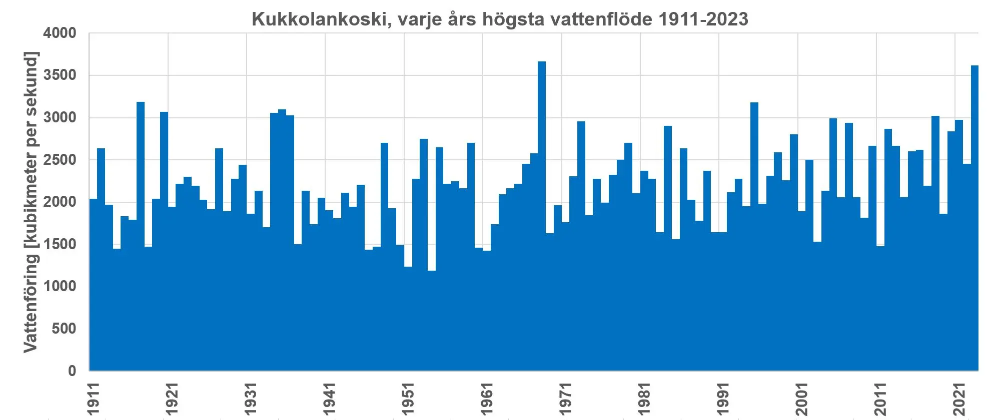 Förstora bildenÅrsdiagram över varje års observerade vattenflöde från 1911 till 2023 i Kukkolankoski. De högsta flödestopparna sker under vårfloden, 1968 års flöde i heldragen svart linje och 2023 i streckad svart linje.