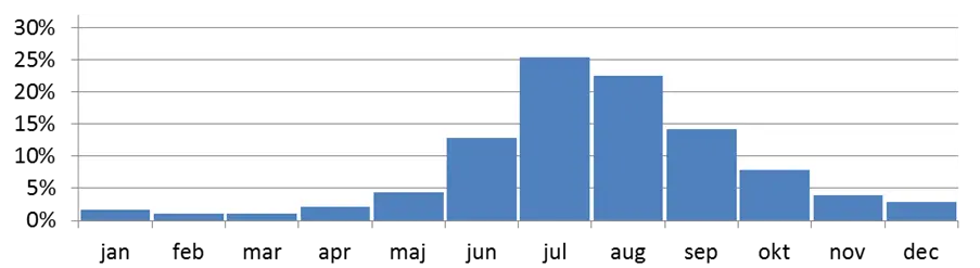 Det är vanligast att årets största nederbördsmängd i Sverige under ett dygn faller under juli följt av augusti. Minst vanligt är att den största mängden faller under februari eller mars.