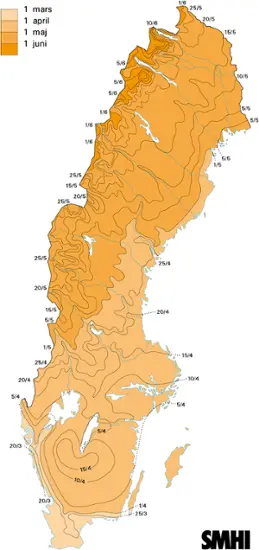 På högfjället ligger snön ibland kvar ända in i juni månad, medan resten av Norrland brukar få snöfritt någon gång i maj eller slutet av april. I sydligaste Sverige brukar de sista dagarna med snötäcke vara i slutet av mars.