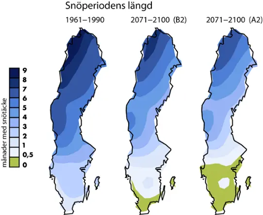 Kartorna nedan visar antal månader med snötäcke för senaste normalperioden samt för perioden 2071-2100, beräknat för dels mindre (B2) och dels större (A2) utsläpp av växthusgaser.