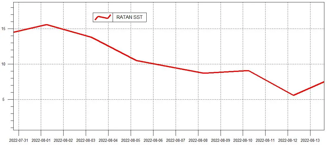 Förstora bildenYtvattentemperatur [°C] vid Ratan i Bottenviken under augusti 2022. Ihållande västliga vindar under denna period medförde upvällning och en sänkning av vattentemperaturen med ungefär 10 grader. SST står för Sea Surface Temperature, som betyder ytvattentemperatur.