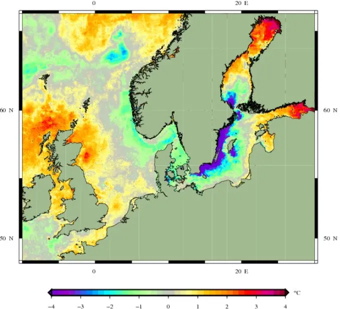 Förstora bildenSatellitmätningar av yttemperatur den 14:e augusti 2023. Temperaturskalan visar anomali, avvikelse i grader C från långtidsmedel 1985-2001 för detta datum. Längs östkusten från Skåne till Uppland kan ses en tydlig situation av uppvällning, med ytvatten som är 3 till 4 gradar kallare än normalt.
