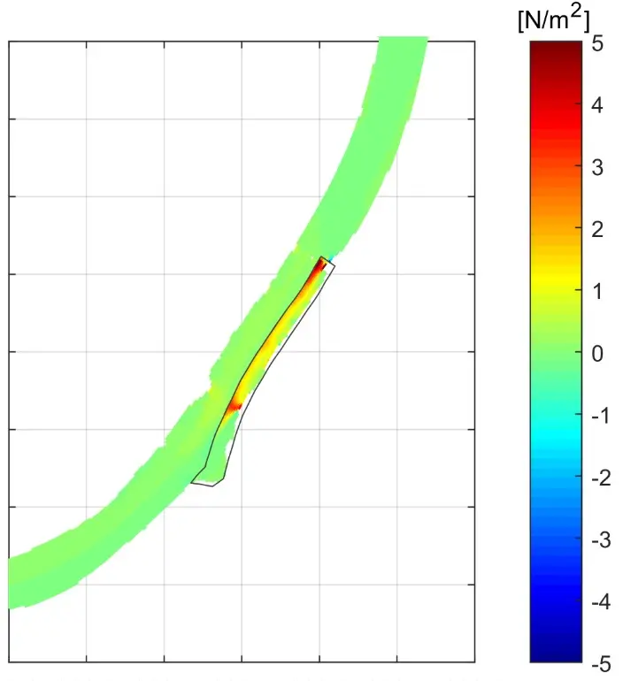 Förstora bildenFiguren visar exempel på skillnader i krafter mot botten med och utan planerade erosionsskydd för ett visst flöde. I röda och gula områden (positiva värden) ökar krafterna mot botten efter placering av erosionsskydd. Den svarta linjen markerar området där erosionsskydden planeras.