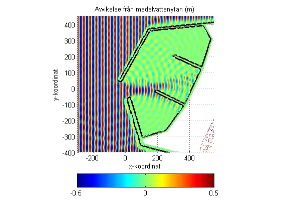 Förstora bildenExempel på hur vågklimatet kan se ut i en hamn, baserat på en tidsupplöst vågmodellering. Vågorna rullar in från vänster. Röd och blå färg indikerar höga vågtoppar/djupa vågdalar.